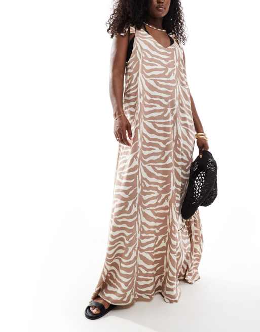 ASOS DESIGN - Maxi-strandkjole med bindedetalje på skuldrene og naturfarvet zebraprint