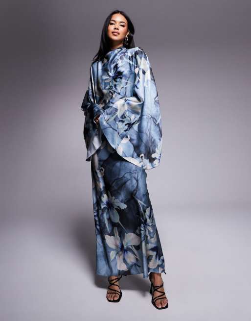 ASOS DESIGN - Maxikjole i satin med blåt blomstermønster, ståkrave og overdrevne ærmer