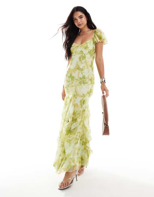 ASOS DESIGN - Maxikjole med flagrende ærmer og flæser i grønt blomsterprint