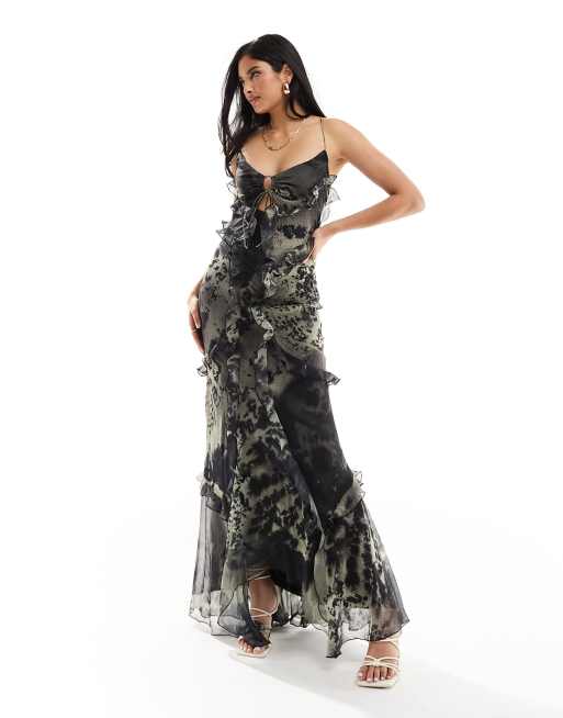 ASOS DESIGN - Maxikjole med halterneck, flæser og udskæring i abstrakt leopardprint