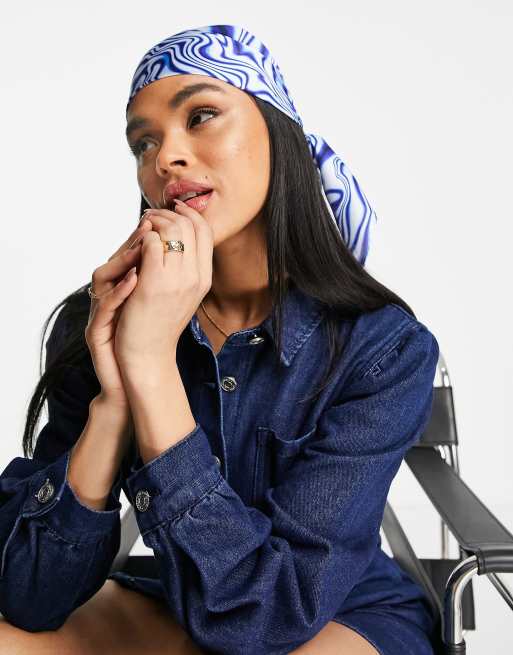 ASOS DESIGN - Medium hovedtørklæde i polysatin med blåt hvirvelprint - MBLUE