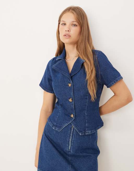 ASOS DESIGN - Mellemblå kortærmet denimskjorte med V-hals - Del af sæt