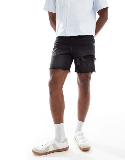 ASOS DESIGN - Mellemlange slim-denimshorts med flænger i sort vask