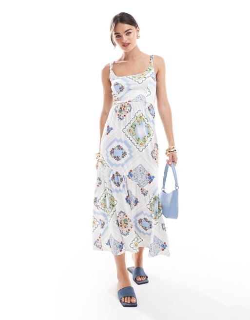 ASOS DESIGN - Midikjole med stropper og firkantet hals i blåt patchwork-print