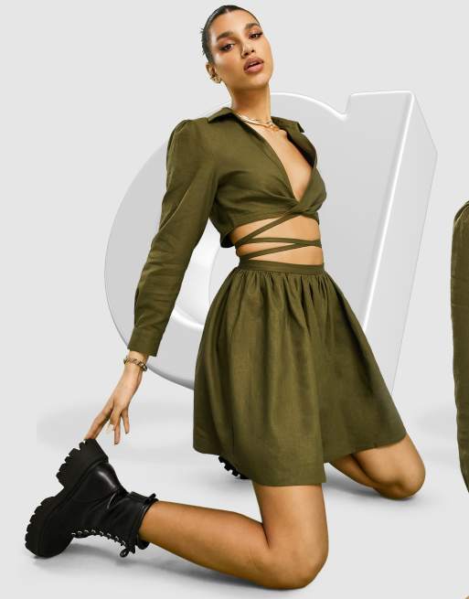 ASOS DESIGN - Mini-skjortekjole i skater-stil med åben talje med bindebånd i kaki hør