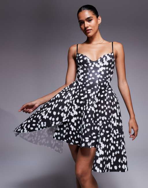 ASOS DESIGN - Minikjole med camistrop fuld kant og asymmetrisk kantdetaljer i prikket print i scuba-lignende stof