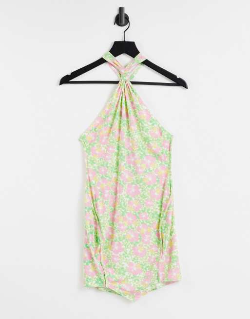ASOS DESIGN - Minikjole med halterneck, knude og slids i 70'er-inspireret blomstermønster
