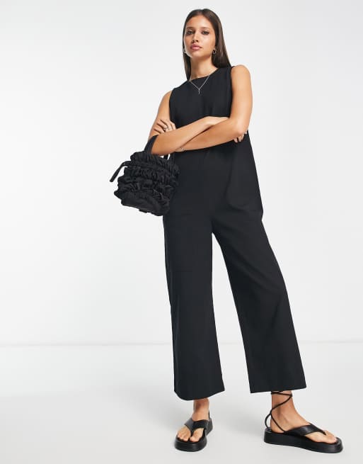 ASOS DESIGN - Minimalistisk ærmeløs jumpsuit med lommer i sort twill