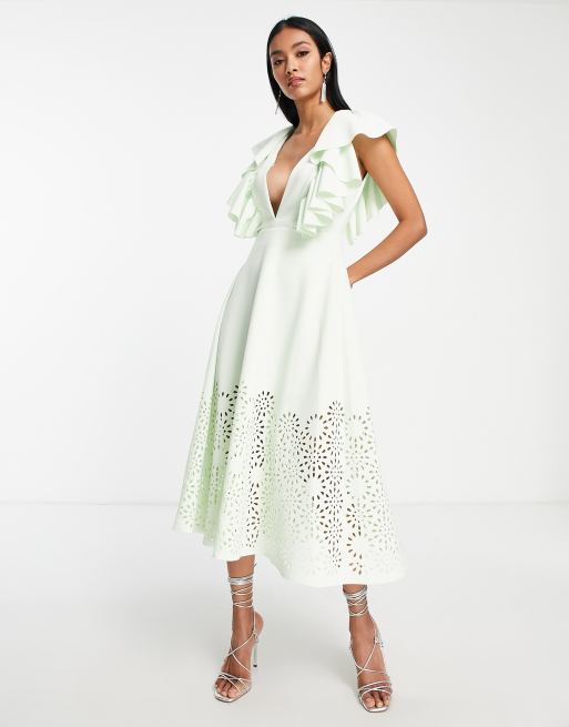 ASOS DESIGN - Mintgrøn midi-gallakjole med dyb udskæring og broderi