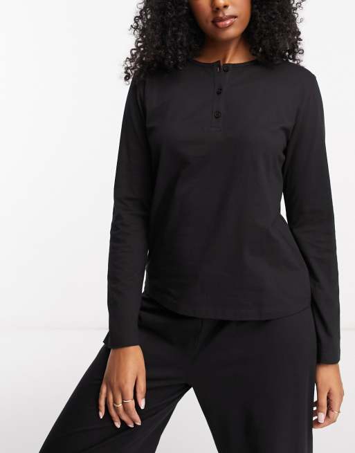 ASOS DESIGN - Mix og match - Henley - Sort langærmet pyjamastop i bomuld