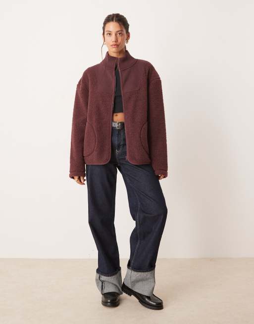 ASOS DESIGN - Mørk blommefarvet fleece med ståkrave og gennemgående lynlås i blanding af strik og imiteret lammeskind