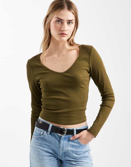 ASOS DESIGN - Mørk olivengrøn ribstrikket top med V-hals og lange ærmer