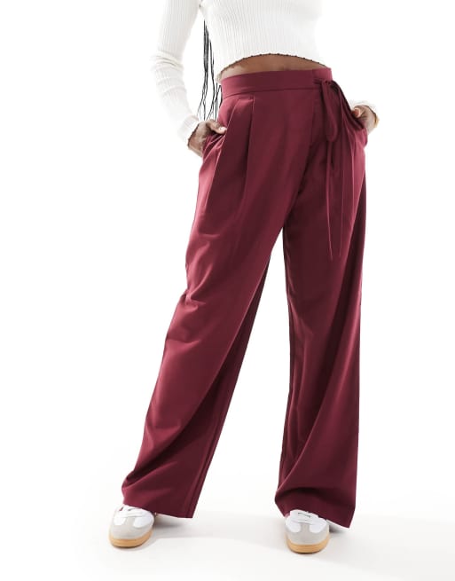 ASOS DESIGN - Mørke kirsebærrøde og skræddersyede bukser med brede ben og slå-om-design med bindebånd