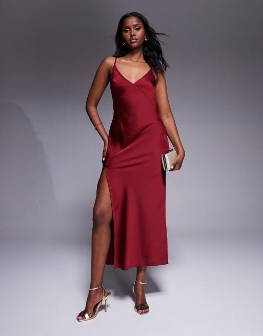 ASOS DESIGN - Mørkerød midaxi-kjole med sømdetaljer, V-hals og slids i satin