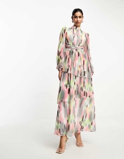 ASOS DESIGN - Multifarvet højhalset tea-maxikjole med rynket talje og slørret blomsterprint