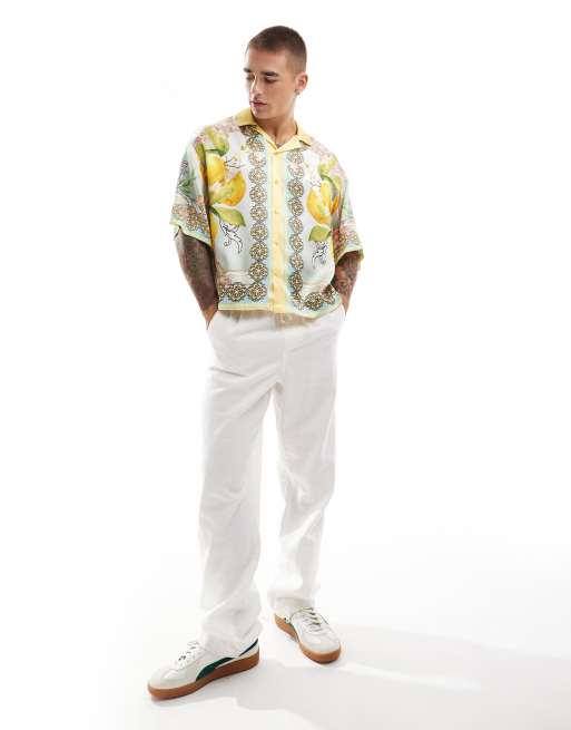 ASOS DESIGN - Multifarvet oversized satinskjorte med kant- og citrusprint i firkantet pasform