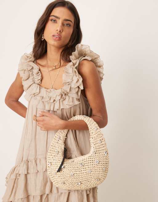 ASOS DESIGN - Naturfarvet hæklet skuldertaske med håndlavet look og dyb, rund form med krystaldetaljer i strå