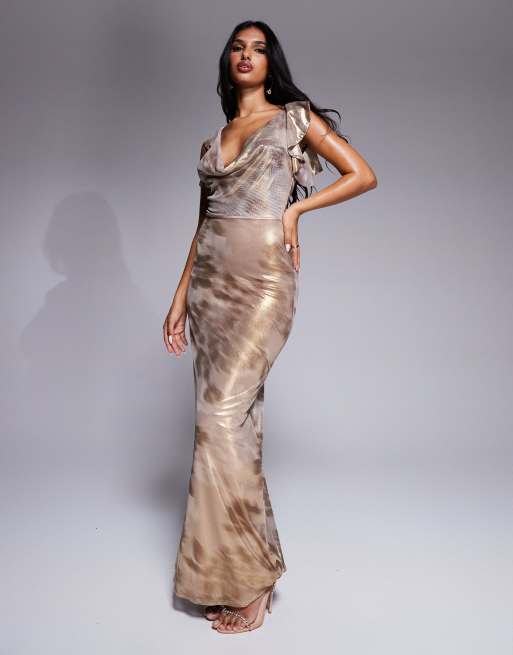 ASOS DESIGN - Naturfarvet maxikjole med dyb vandfaldsudskæring, bindebåndsdetalje og blomstermønster med glimmer