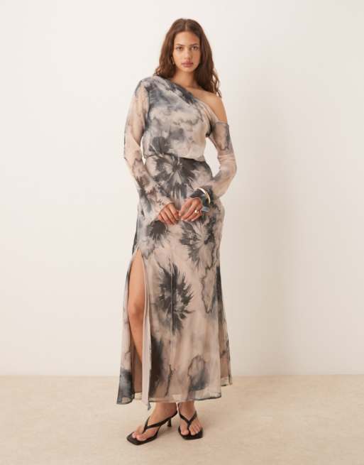 ASOS DESIGN - Offshoulder-midikjole med sømdetaljer og blækprint med blomstermønster