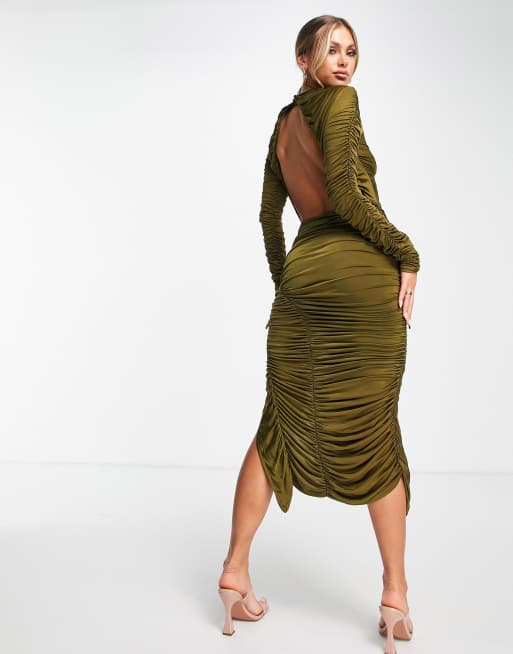 ASOS DESIGN - Olivengrøn langærmet rynket asymmetrisk midikjole