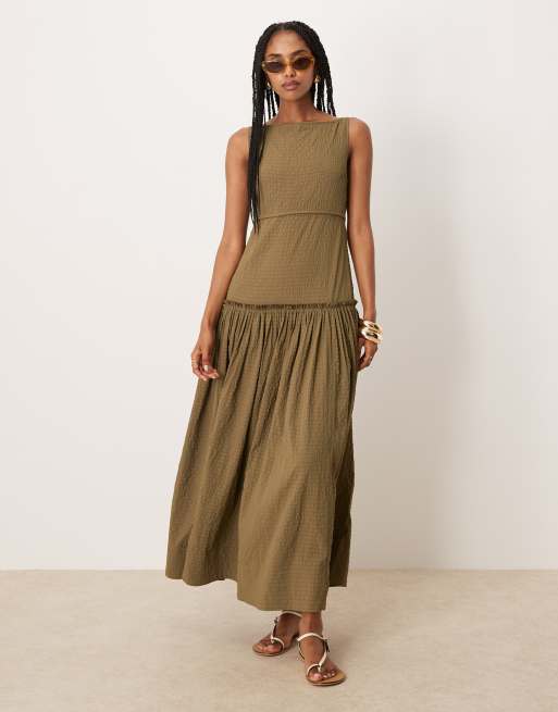 ASOS DESIGN - Olivengrøn maxikjole med bred halsudskæring og sømdetaljer i krølstof