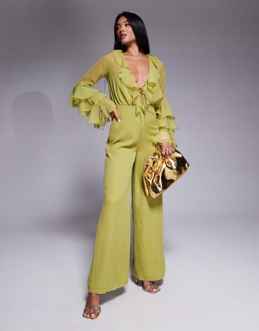 ASOS DESIGN - Olivengrønt jumpsuit med lange ærmer, flæser og bindedetalje
