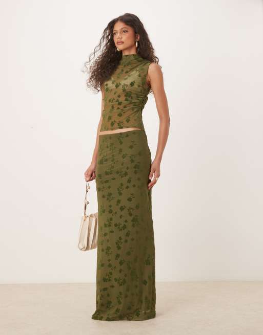 ASOS DESIGN - Olivengrønt sæt med tynd rynket højhalset ærmeløs flock-overdel og maxinederdel