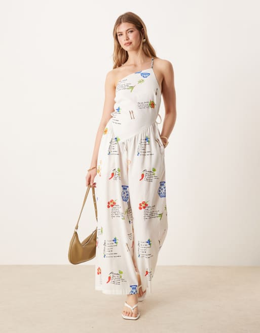 ASOS DESIGN - Oneshoulder-jumpsuit med åben ryg pg print i hør