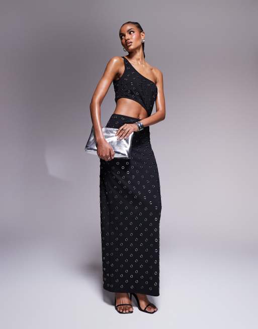 ASOS DESIGN - Oneshoulder-maxikjole med nitter og søjlesnit i sort