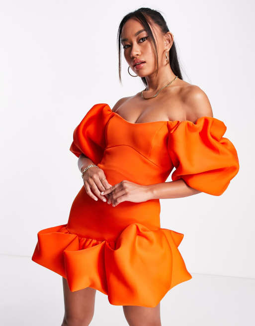 ASOS DESIGN - Orange bardot-minikjole med ekstremt ballondesign forneden