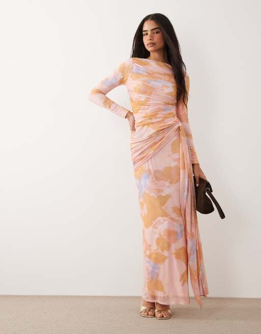 ASOS DESIGN - Orange langærmet maxikjole i mesh med blomstermønster