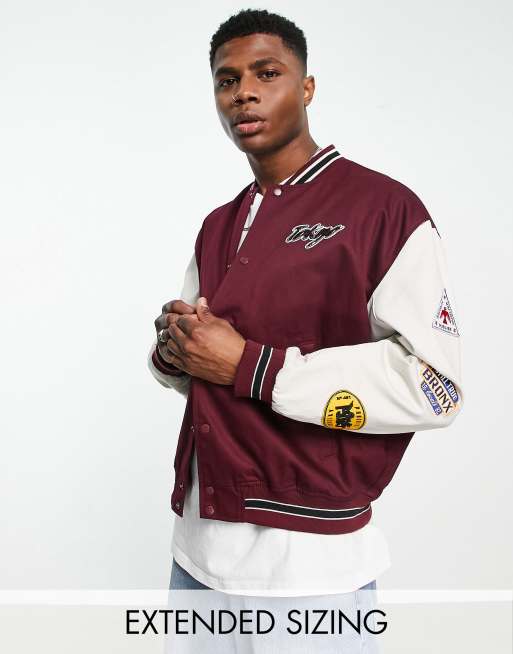 ASOS DESIGN - Oversized bomber-jakke med college-detaljer i bordeaux