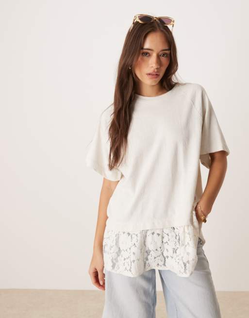 ASOS DESIGN - Oversized cremehvid T-shirt med raglan-ærmer og blondekant