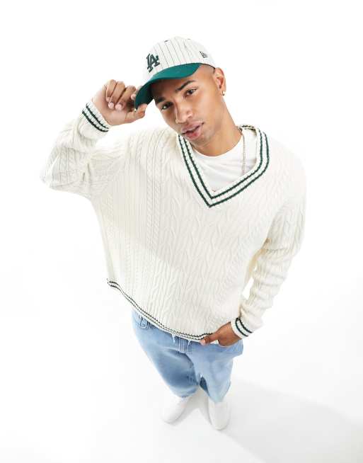 ASOS DESIGN - Oversized cricket-trøje med grønne kanter i cremehvid kabelstrik