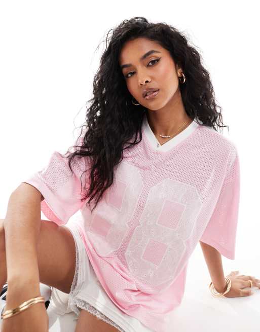 ASOS DESIGN - Oversized lyserød football-T-shirt med v-hals og talprint i blondestof