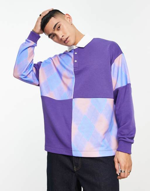 ASOS DESIGN - Oversized og lilla rugby-sweatshirt med poloskjorte og ternede paneler
