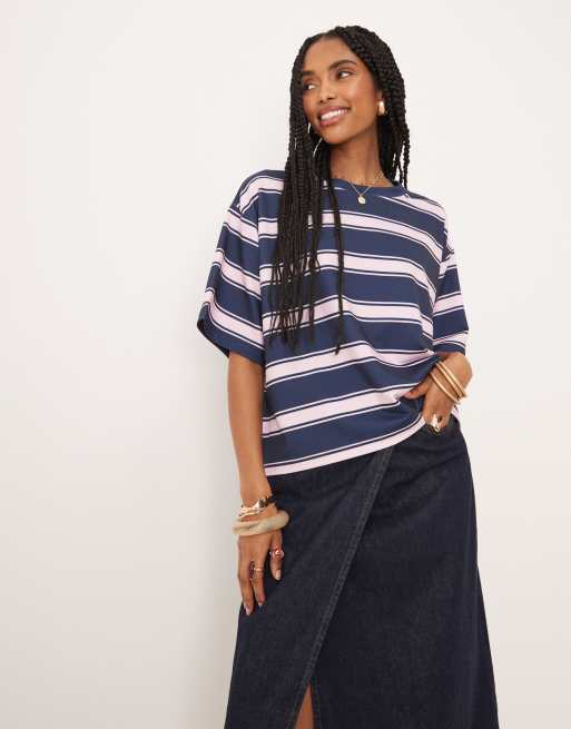 ASOS DESIGN - Oversized og marineblå T-shirt med lyserøde striber