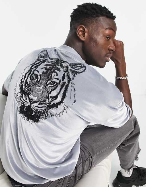 ASOS DESIGN - Oversized T-shirt i grå velour med tigerbroderi bagpå