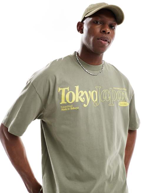 ASOS DESIGN - Oversized T-shirt i lys kaki med byprint foran