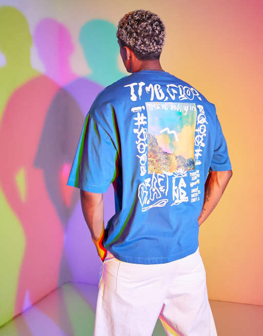 ASOS DESIGN - Oversized T-shirt i marineblå med bjerg- og graffitiprint bagpå