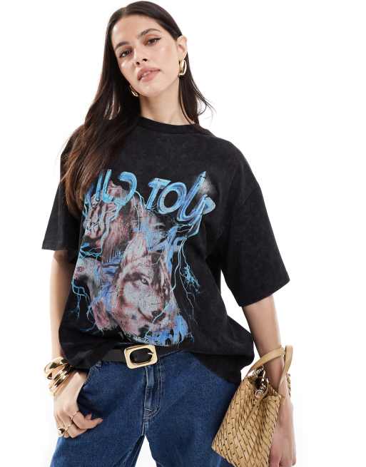 ASOS DESIGN - Oversized T-shirt med ulve- og rockgrafik i vasket koksgrå