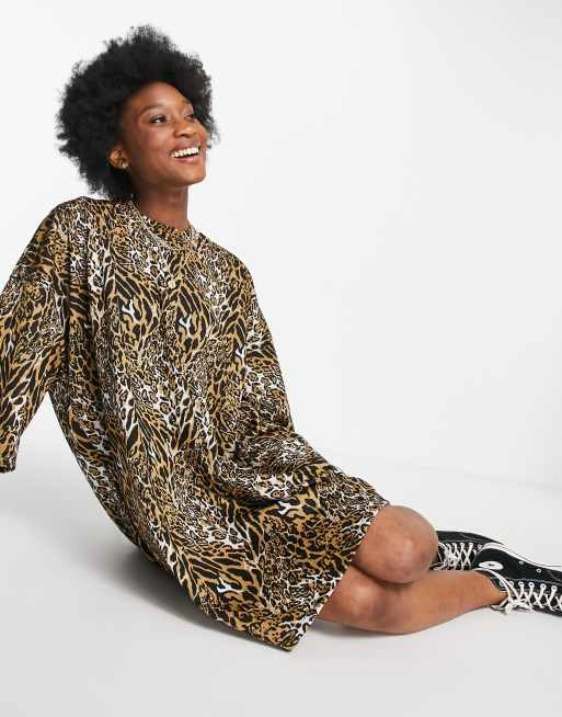 ASOS DESIGN - Oversized, tekstureret t-shirt-kjole i brunt leopardprint