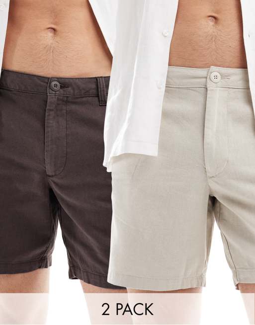 ASOS DESIGN - Pakke med 2 par mellemlange, smalle shorts med fast talje i brunt/beige hør
