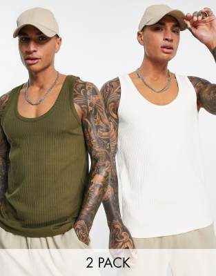 ASOS DESIGN - Pakke med 2 ribstrikkede toppe i hvid og kaki