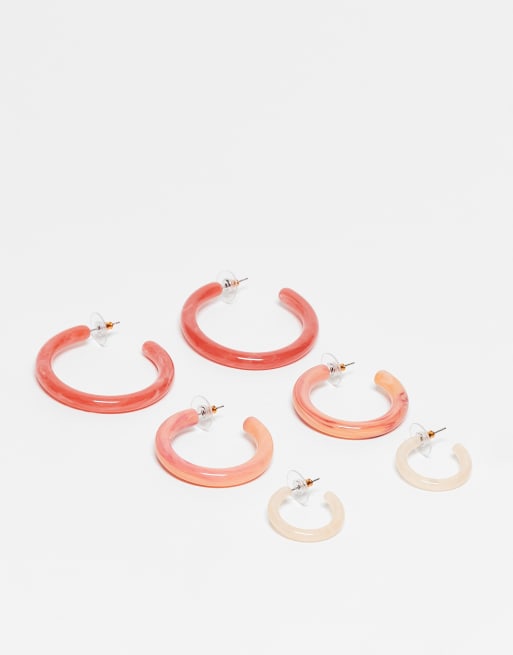 ASOS DESIGN - Pakke med 3 par hoop-øreringe i resin i ferskenfarvede/lyserøde nuancer i forskellige størrelser