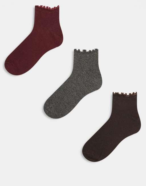 ASOS DESIGN - Pakke med 3 par korte ankelsokker med flæsekanter i bordeaux/grå/chokoladebrun