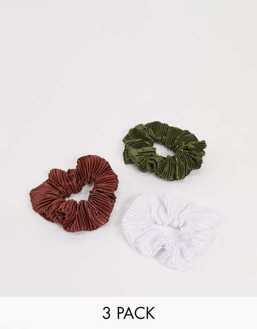 ASOS DESIGN - Pakke med 3 plisserede scrunchies i brun kaki og hvid