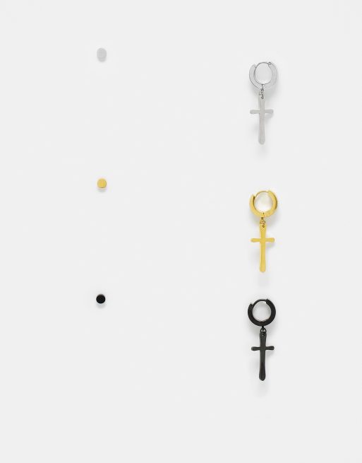 ASOS DESIGN - Pakke med 3 sæt øreringe i rustfrit stål med ørestik og hængeørering med korsvedhæng i mat sort/guldfarve/sølvfarve