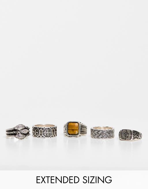 ASOS DESIGN - Pakke med 5 ringe i poleret sølvfarve med klo- og kompasdesign