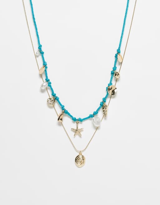 ASOS DESIGN - Pakke med halskæder med blå snor og guldfarvet kæde og havlivsvedhæng